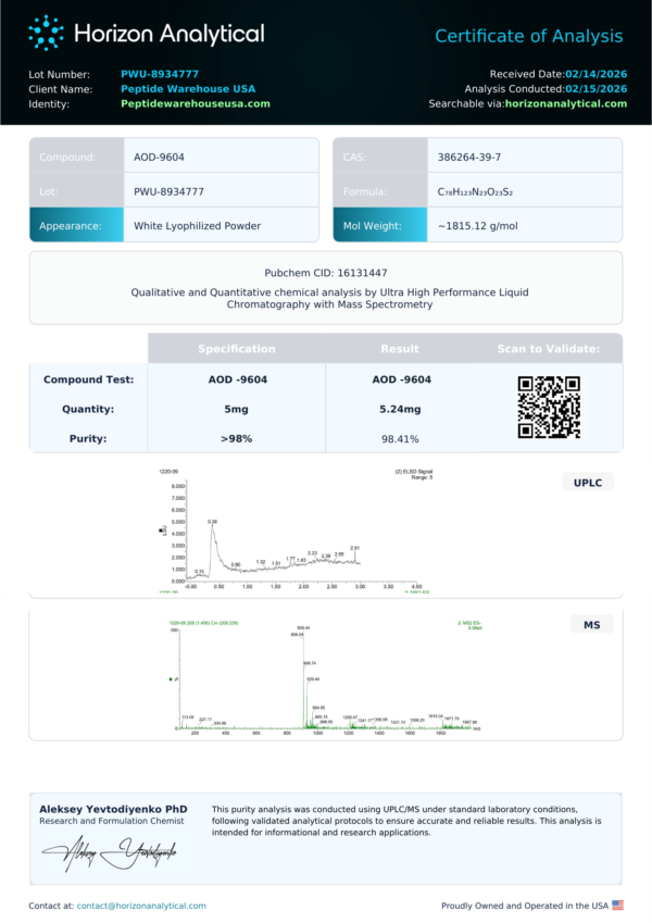 AOD-9604 is a synthetic peptide derived from a modified fragment of growth hormone. It is commonly studied for its role in fat metabolism and its ability to influence lipolysis (fat breakdown) without significantly affecting blood sugar levels.