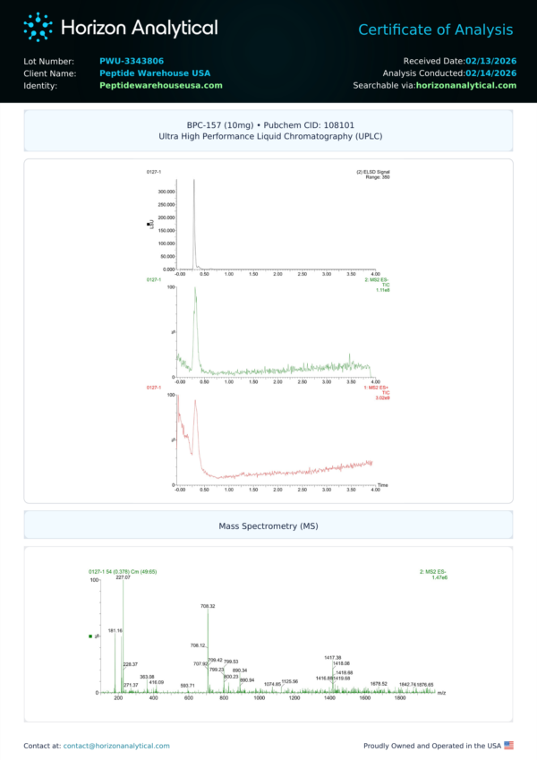 Buy BPC-157 in the USA with confidence. Our research peptides are manufactured under strict quality control standards and verified through third-party testing, including COAs, endotoxin screening, and microbial analysis.